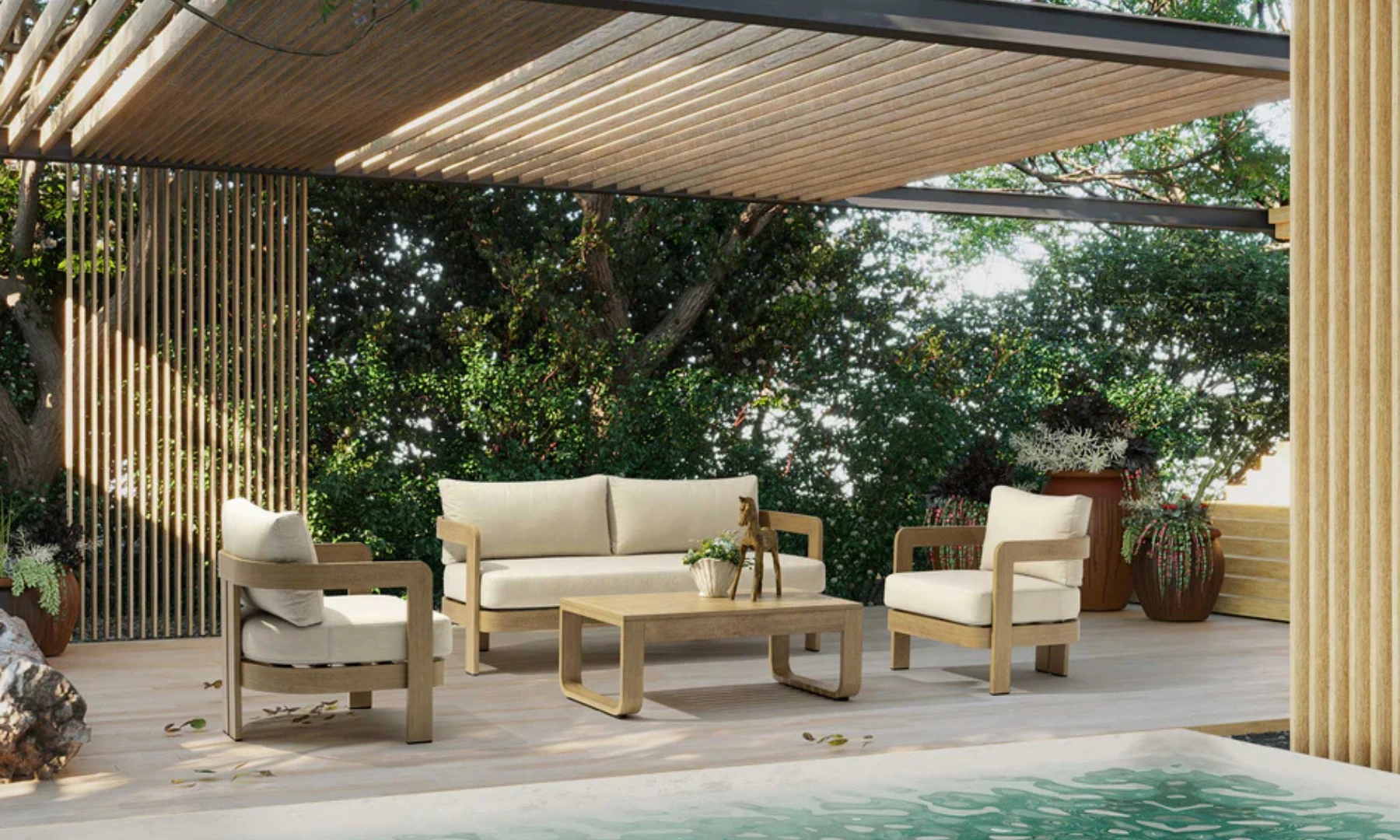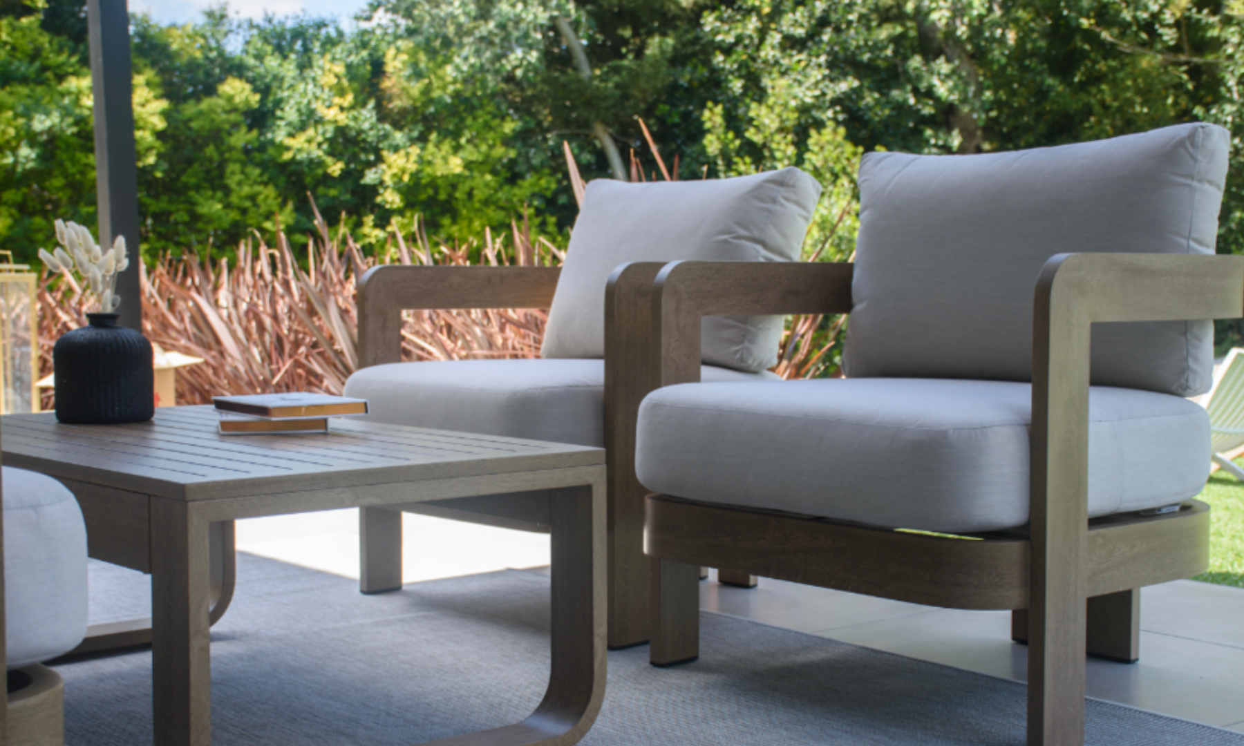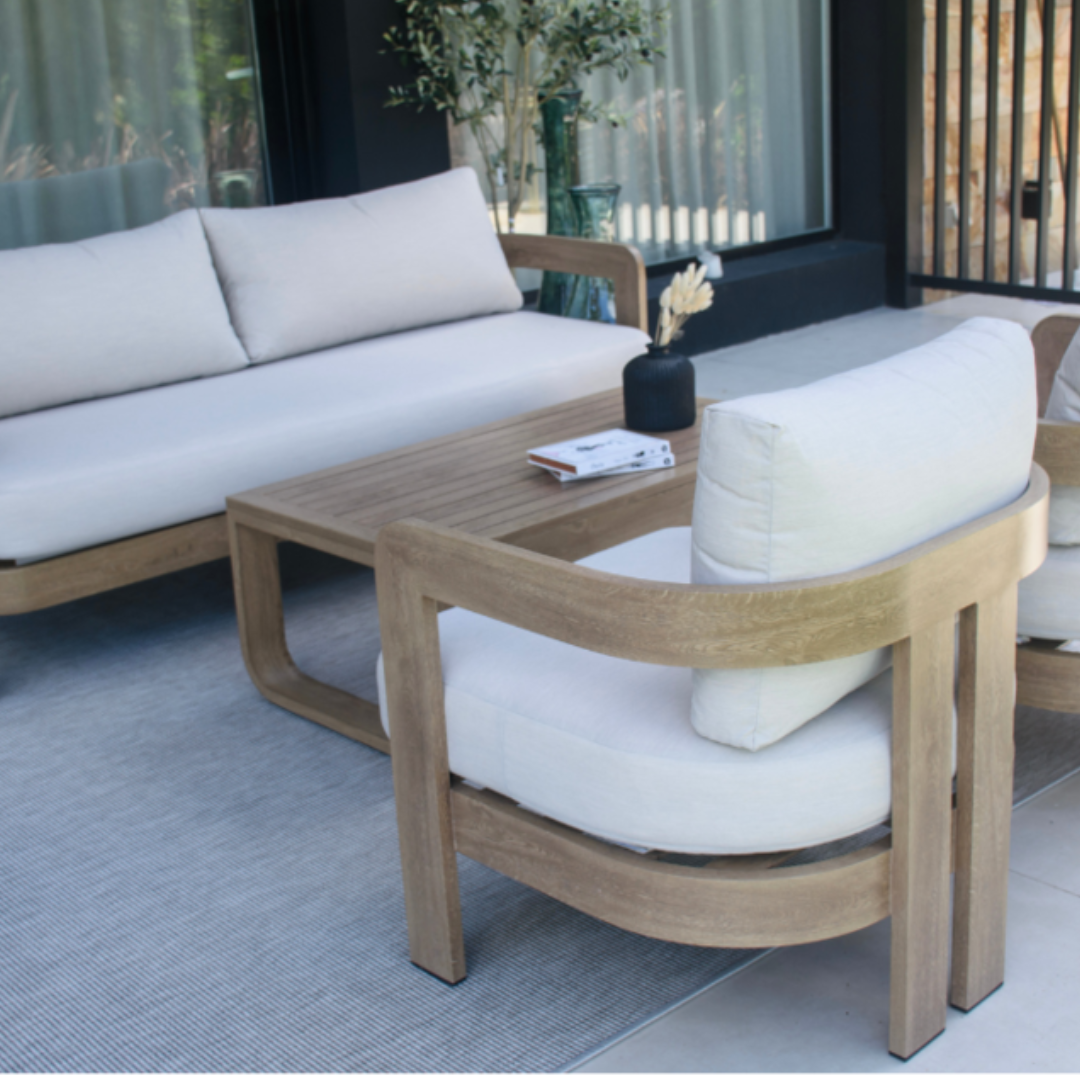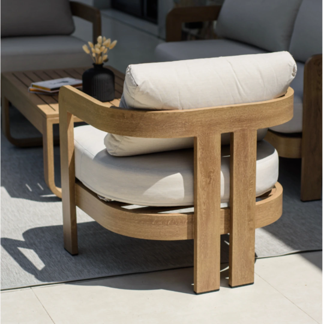 Descubrí el conjunto de living PALAMOS, una pieza perfecta de diseño moderno. Su estructura es de aluminio simil madera y es ideal para usarlo al aire libre.