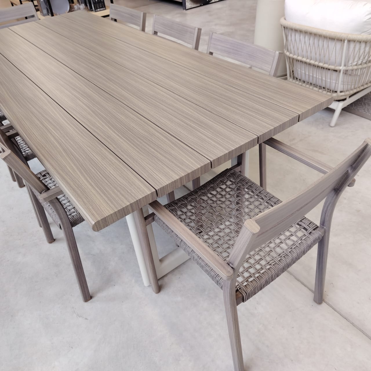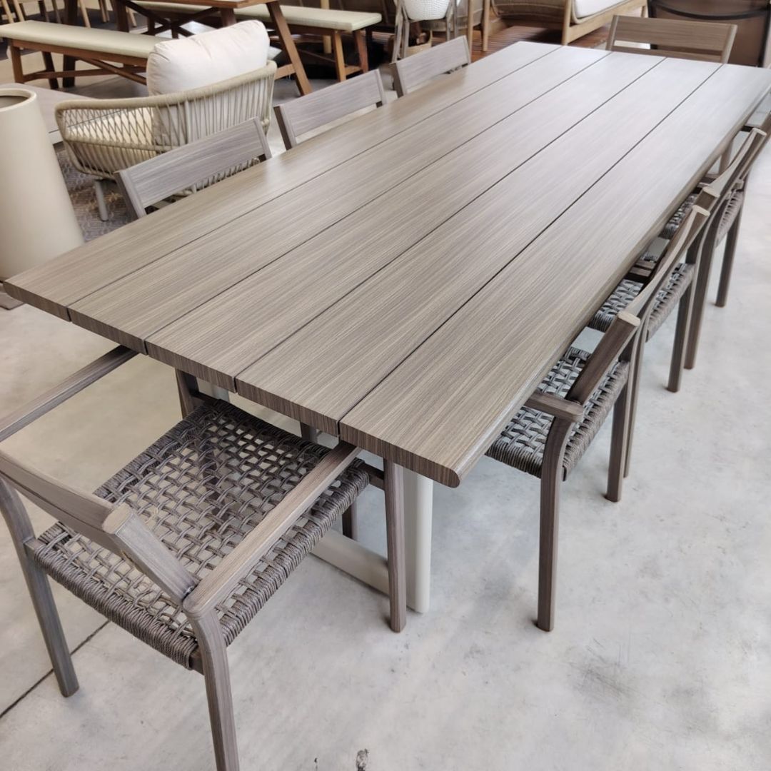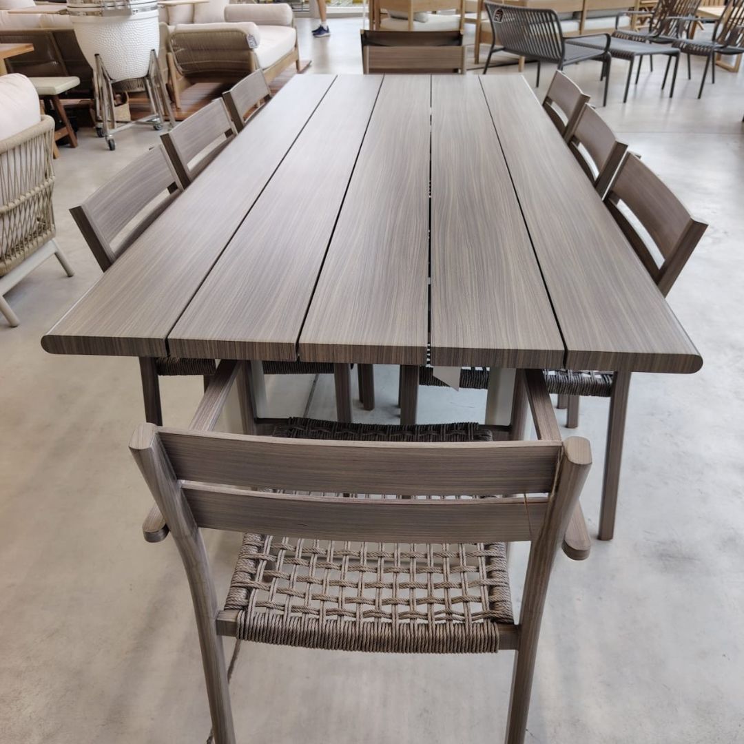 Descubrí el conjunto de mesa y 8 sillas THEODORA, una pieza perfecta de diseño moderno. Su estructura es de aluminio simil madera y cuerda.