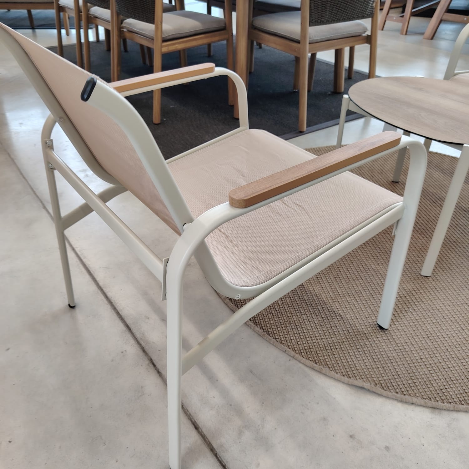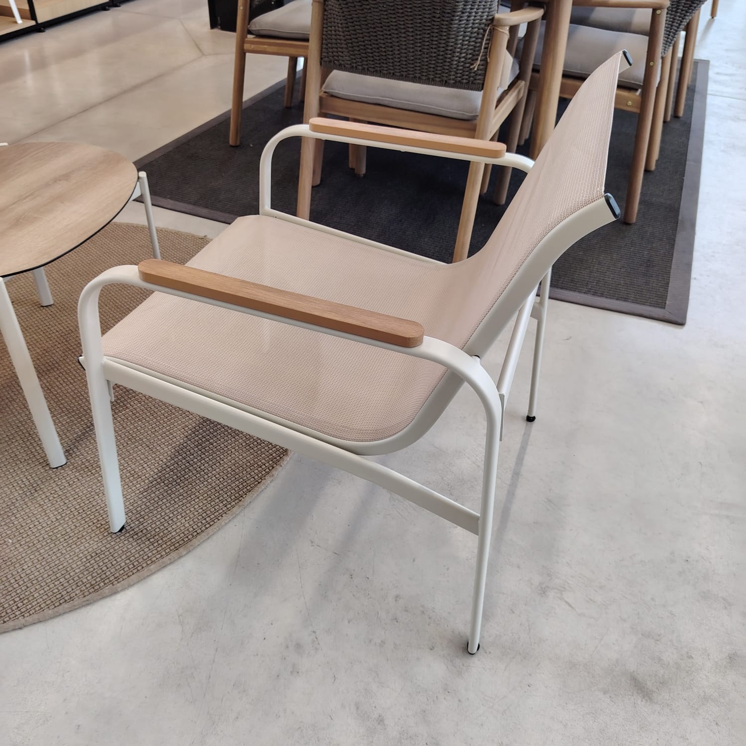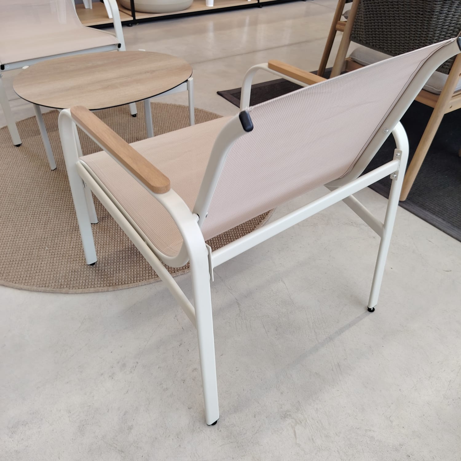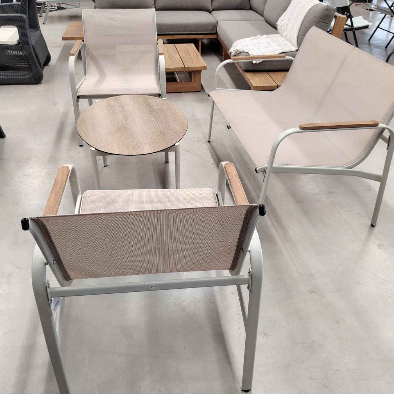 El conjunto TINOS conjunto está fabricado en textilene y acero con apoyabrazos de madera rubberwood y mesita de acero con tapade vidrio.